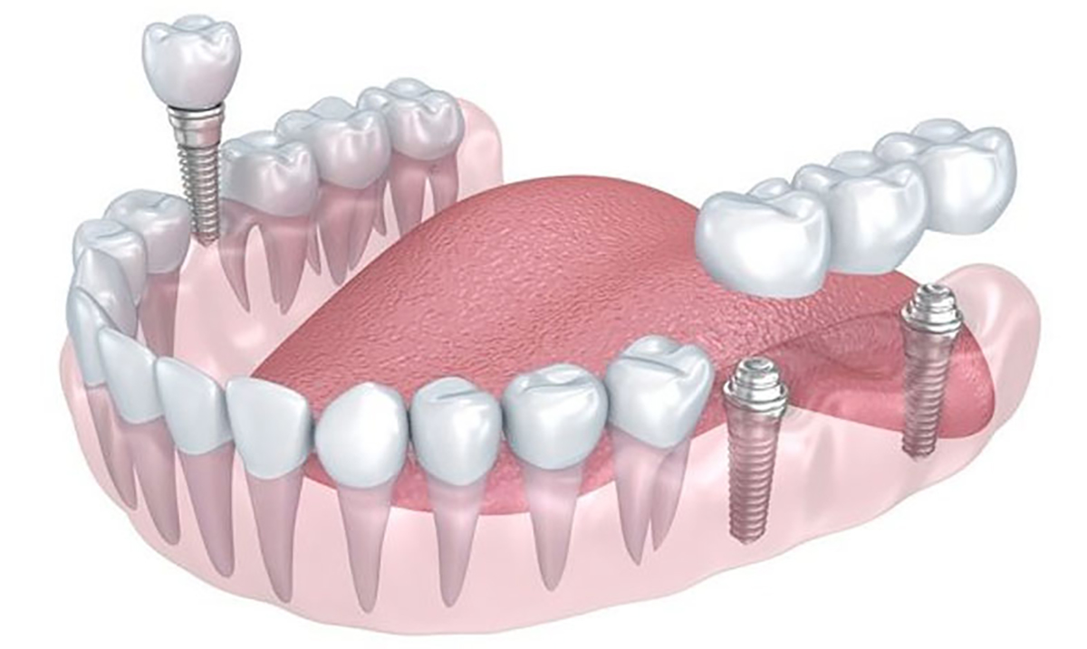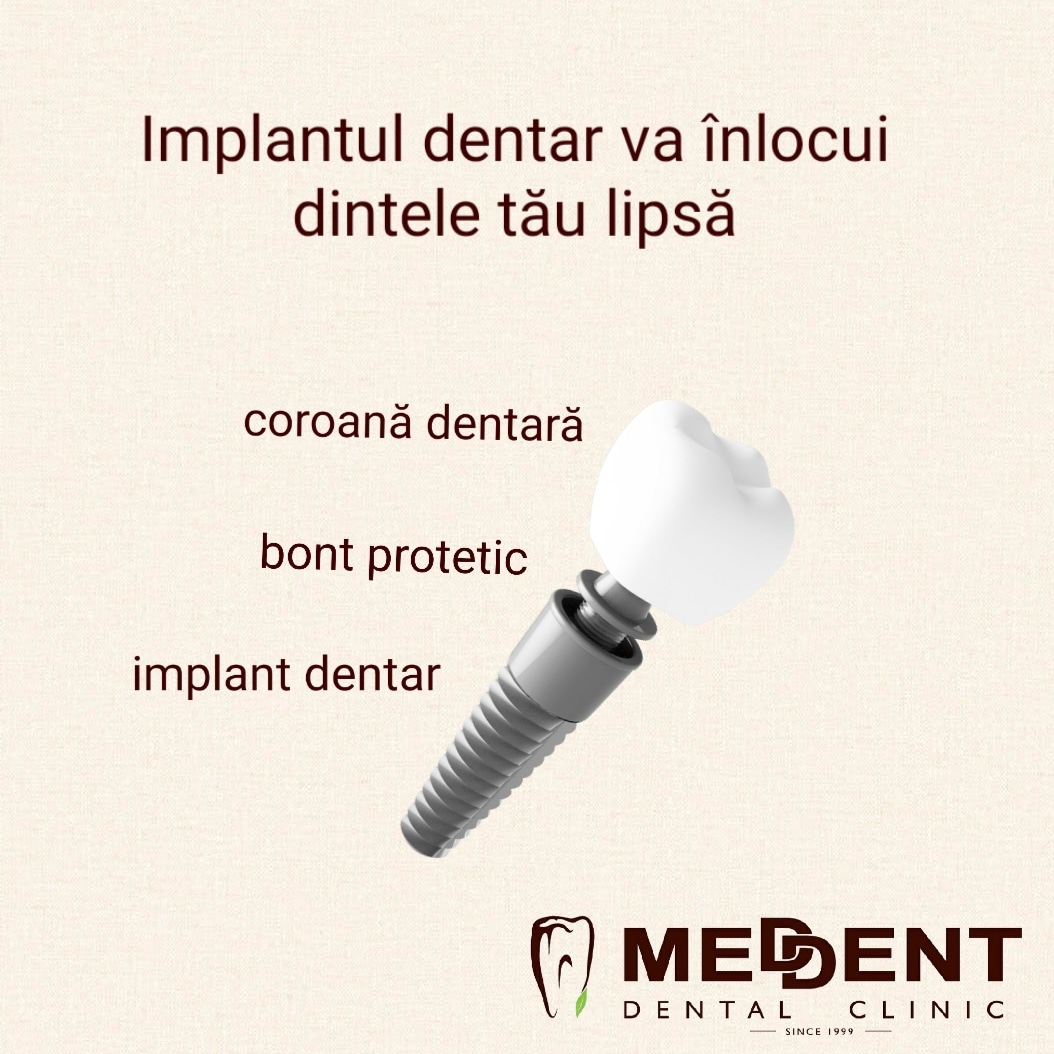 Implantul dentar este o piesă din titan pur, având, în general, forma de șurub. El are menirea de a crea o rădăcină artificială în osul maxilar, acolo unde dintele sau dinții naturali lipsesc. Reconstrucția este formată din două segmente — unul intra-osos (implantul) și unul supra-osos numit bont protetic. Deasupra bontului protetic se ancorează o coroană, o punte sau o proteză. Tratamentul este conservator în comparație cu o lucrare tradițională prin punte, deoarece implanturile dentare elimină necesitatea sacrificării dinților învecinați. În cazul în care confecționăm o punte dentară, aceasta are nevoie pentru ancorare de minimum 2 dinți stâlpi, dinți ce vor fi din păcate sacrificați (se extrag nervii, se obturează canalele și se șlefuiesc dinții care odinioară erau sănătoși).